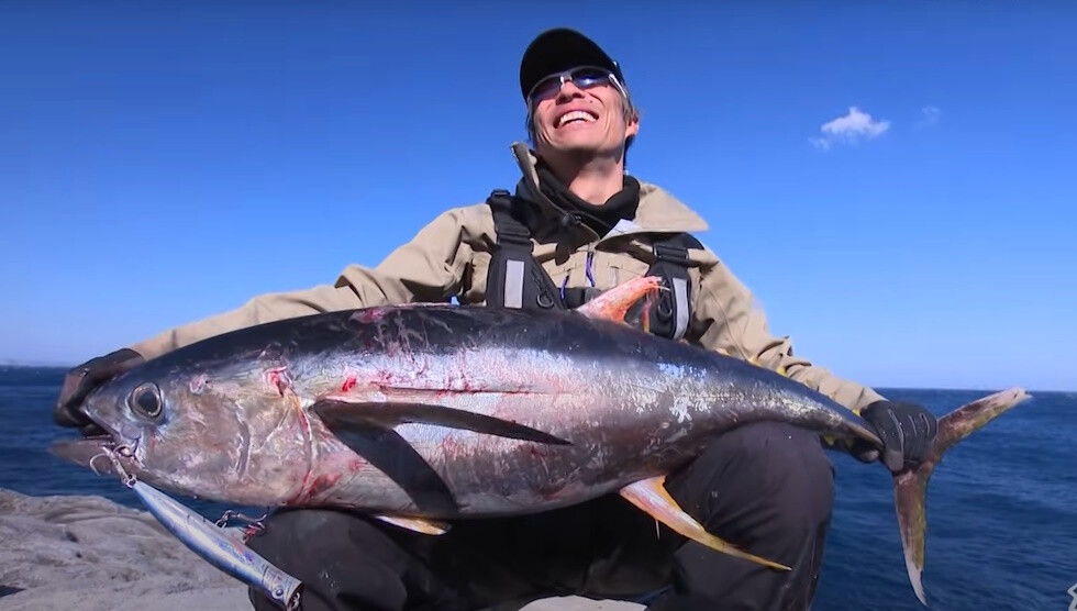 Palmsの沼田純一さんが神津島のロックショアでキハダを狙う。